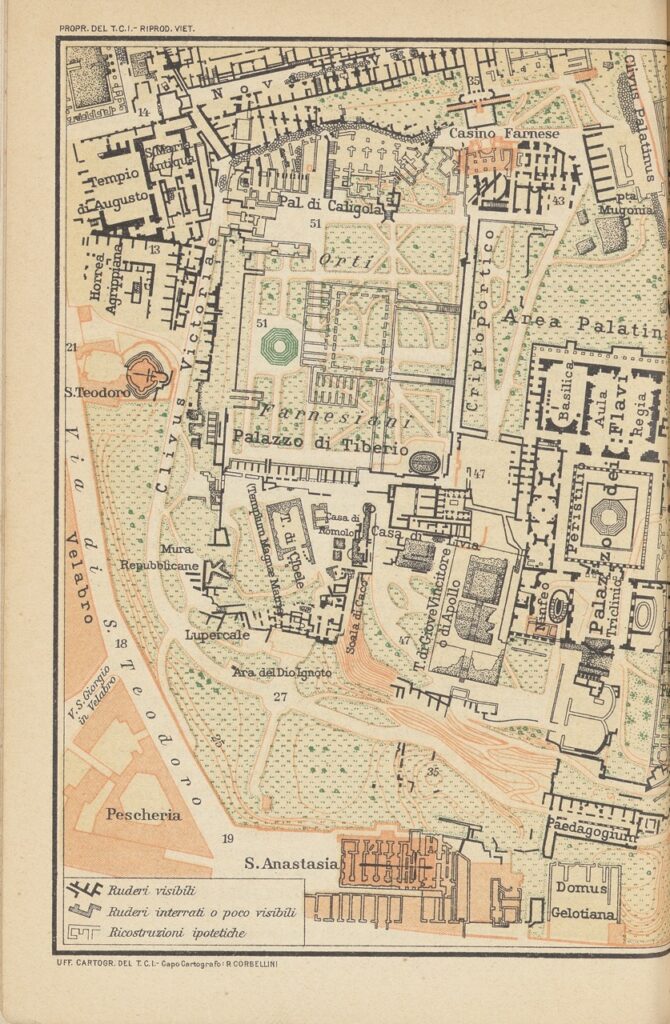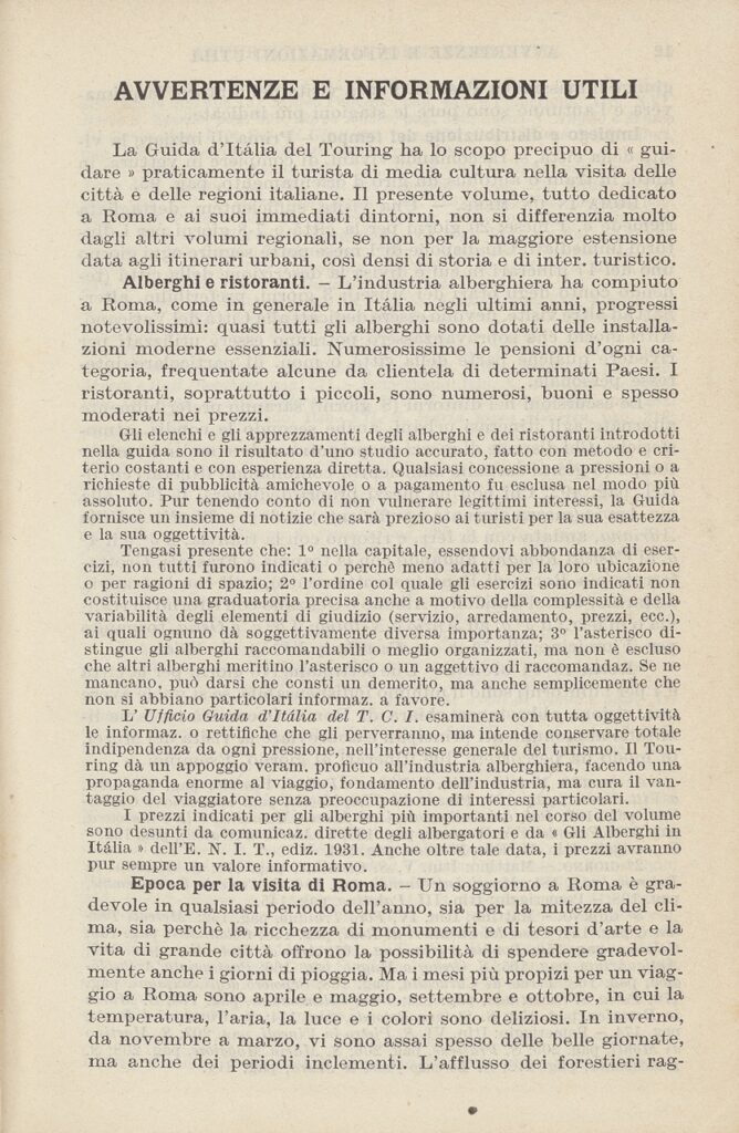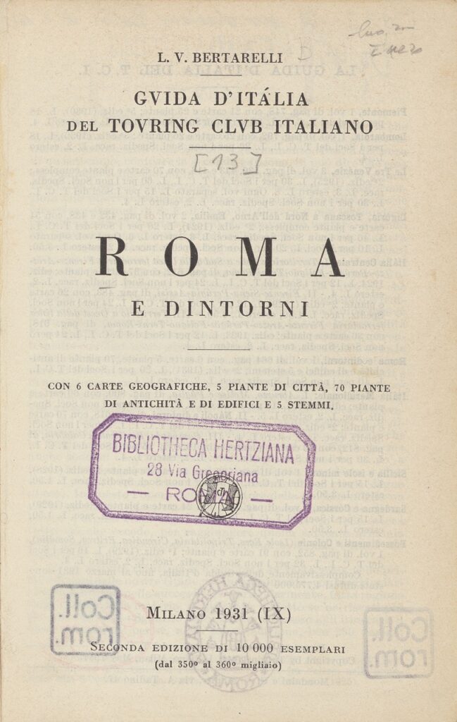 La Guida di Roma e dintorni incarna la sintesi del metodo del Touring, in cui l’esperienza diretta sul campo e la documentazione scientifica diventano strumenti di conoscenza del territorio nazionale. In questo senso, la sua pubblicazione segna un momento culminante della missione culturale del Touring Club, inteso da Bertarelli come un progetto di educazione civica e geografica attraverso il viaggio. [VC]
