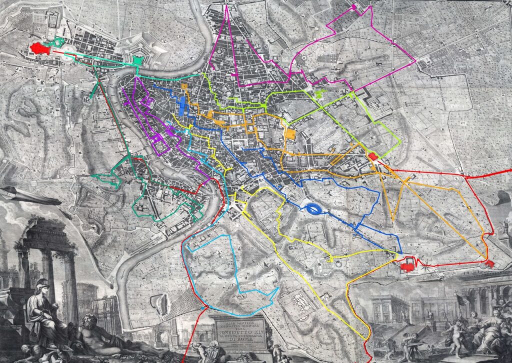 La Roma ricercata nasce con il solo scopo di guidare il forestiero per le strade dell’Urbe, suggerendogli pratici itinerari da seguire per visitare l’intera città in dieci giorni. La mappa digitale mostra chiaramente l’attenta organizzazione dello spazio urbano compiuta da Martinelli. La maggior parte dei percorsi inizia e termina nella parte occidentale della città, nei rioni di Ponte e Parione. L’autore prende come riferimenti la strada dell’Orso e di Tor di Nona perché in quella zona si concentrano la maggior parte delle strutture alberghiere per i forestieri. L’ultima giornata è dedicata invece al celebre ‘giro delle sette chiese’. L’inserimento di questo percorso è forse la testimonianza più eloquente del profondo valore spirituale che ancora permea la Roma ricercata. La guida privilegia sempre un’interpretazione cristiana del patrimonio della città, a tal punto che importanti monumenti pagani, come l’Obelisco vaticano e la Piramide Cestia, divengono vere e proprie metafore religiose. [AC]